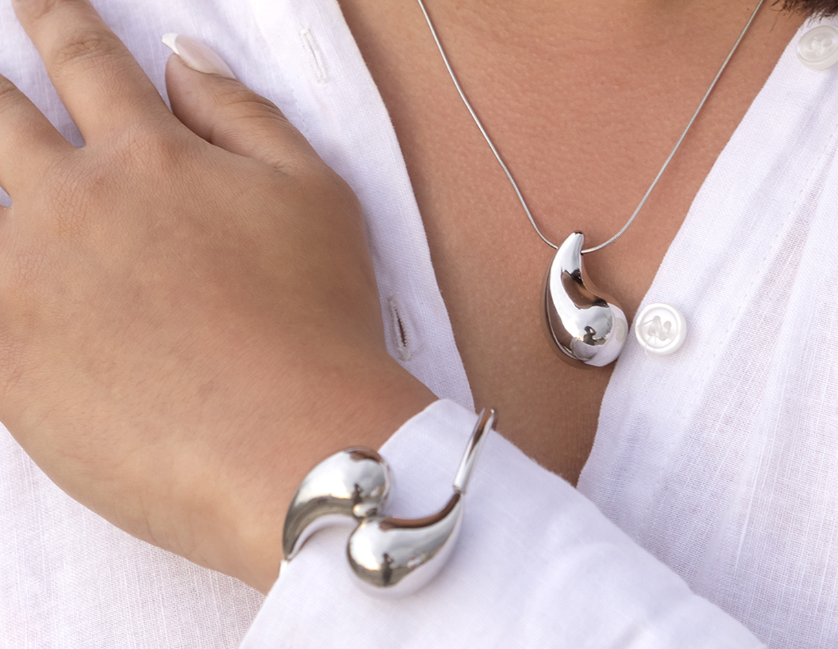 0Pulsera Brazalete Dual Touch con baño de plata, una pieza minimal con punch: dos gotas de color que aportan contraste y un brillo muy limpio. Fabricada en aleación de zamak, es hipoalergénica y súper cómoda gracias a su formato abierto y ajustable.